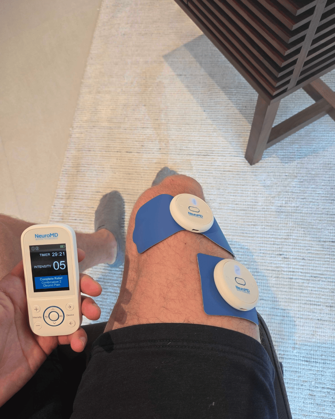 Place the NeuroMD device on your body, using the remote adjust the intensity, and enjoy a 20-minute session for lasting pain relief.